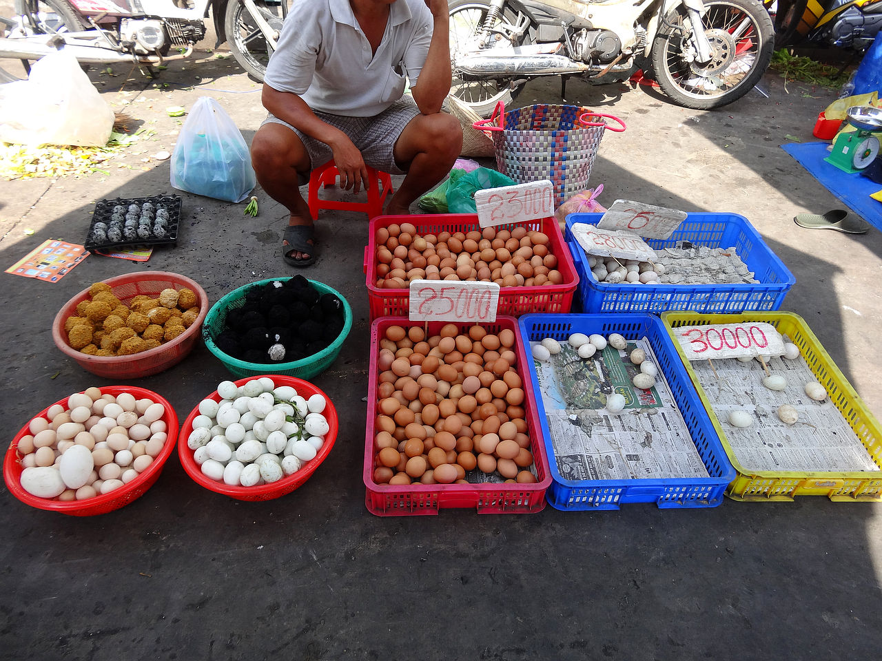 ベトナムの市場は、メインの建物の周りに、圧倒的に多い生鮮食料品をバイクで買い物来る客の為に、場外の道路上にお店(露店)がある事が多いです。特に野菜、果物、魚類は屋外のお店で売っている方が圧倒的に多いです。肉類はまだ場内が多いですね。逆に建物の中には衣類や日用品などのお店が多く集まります。